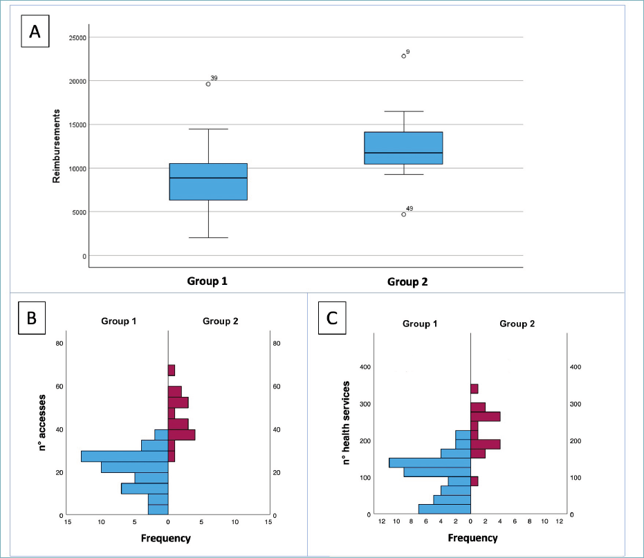 For each patient, we collected: 1) total reimbursement required, 2) type and 3) number of health services and 4) number of hospital accesses.