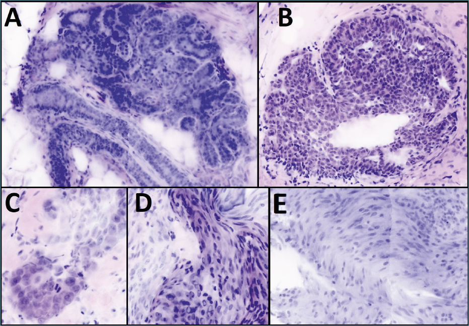 Figure 1. Ex-vivo CFM images of: (A) Normal breast terminal duct-lobular unit; (B) Usual ductal hyperplasia of the breast; (C) Infiltrating ductal breast carcinoma NOS; (D) A neurosurgical biopsy of a meningothelial meningioma, showing nuclear pseudo-inclusions and whorl formation; (E) Verocay bodies seen in a neurosurgical biopsy of a Schwannoma tumor.