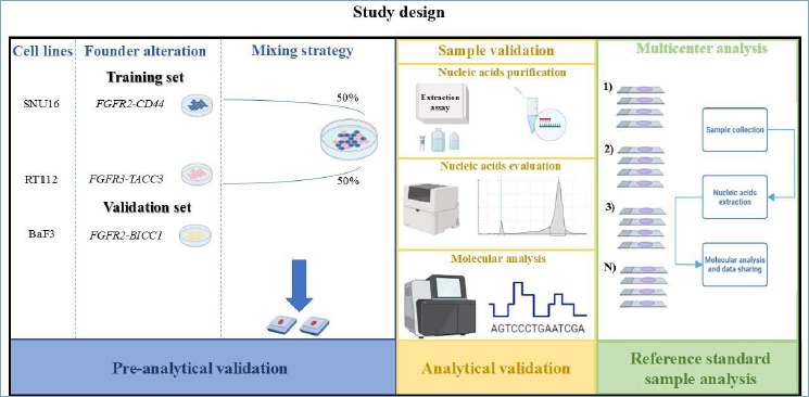 Cholangiocarcinoma (CCA) consists of a heterogeneous group of tumors classified as intrahepatic or extrahepatic on the basis of biliary tract localization 1. In terms of incidence, CCA represents the most common liver cancer and CCA mortality is rapidly increasing, worldwide 2. Although CCA patients may undergo surgery (35.0% of cases), gemcitabine plus cisplatin for first line treatment is warranted as standard of care for relapsing patients within 2 years 3. Molecular profiling identifies potentially druggable alterations in up to 40.0% of CCA patients 4. On this basis, intrahepatic cholangiocarcinoma (ICC) and extrahepatic cholangiocarcinoma (ECC) have distinct molecular patterns where TP53, ARID1A, IDH1/2, PBRM1, BAP1 and PIK3CA and KRAS are frequently mutated in ICC and ECC patients, respectively 5,6. As a consequence, prognostic implications and therapeutic options are widely influenced by histological-molecular classifications. Patients with ECC frequently undergo surgery, but the 5- year survival rate is 18.0-23.0% . Conversely, ICC patients were surgically treated in a lower percentage of cases, but 5-year survival rates were 30-40% 7. Of note, fibroblast growth factor receptor (FGFR) encodes for a family of four extracellular membrane tyrosine kinase (TK) receptors activating pro-angiogenetic and proliferative molecular pathways 8. Noteworthy, FGFR2 aberrant transcripts and rearrangements play a pivotal role for malignant transformation occurring in 15.0% of iCCA patients. Recently, FGFR2 has been identified as a clinically useful biomarker for personalized therapy 9-12. The open-label phase II FIGHT-202 study aimed to assess the efficacy and safety of a novel TKIs against aberrant FGFR2 (pemigatinib) in a series of 146 iCCA patients 13, showing a disease control rate (DCR) of 82.0% of iCCA patients with FGFR2 aberrant transcript 14. Moreover, post-hoc analysis revealed a PFS of 7.0 months in FGFR2 rearranged iCCA patients compared with other FGFR2 mutations and FGFR2 wild-type groups 14. Additionally, two independent real-world cohorts confirmed a similar clinical efficacy in terms of DCR and median PFS (84.7% and 8.7 months, respectively) 15. To date, fluorescent in situ hybridization (FISH) using break-apart probes or dual fusion probes is the most common tool to detect FGFR2 rearrangements 16. Unfortunately, FISH is affected by high false negative rate, unknown fusion partners (break apart probes) and a low inter-laboratories reproducibility rate. In the recent era of precision oncology, the widespread diffusion of next generation sequencing (NGS) platforms successfully detects clinically informative molecular alterations from diagnostic routine samples 1. Several NGS assays (both DNA and RNA based panels) covering FGFR2 rearrangements have been developed to optimize diagnostic workflow for iCCA patients. Target specific and unbalanced FGFR2 assays may be adopted to detect clinically relevant aberrant fusions 17. The successful implementation of testing strategy depends on several factors such as turnaround time (TAT), heterogenous sampling approaches (small biopsy, surgical resection, cytological samples) technical costs, and skilled personnel 10. Remarkably, the lack of harmonized procedures drastically impacts on the accuracy of molecular analysis in diagnostic routine samples 14. We aimed to evaluate the technical performance of diagnostic testing strategies for FGFR among 8 representative Italian institutions. Each participating institution was asked to analyze artificial reference samples built on engineered cell lines carrying FGFR2-3 aberrant transcripts. Concordance rates were assessed by comparing molecular records among participating institutions.