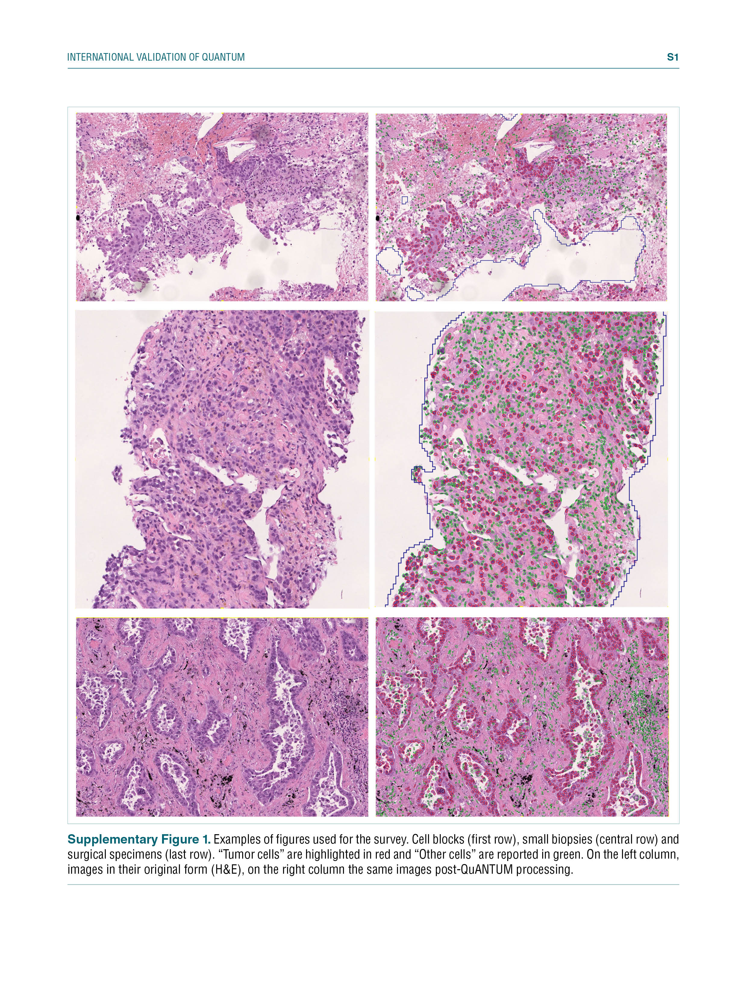 Supplementary Figure 1. Examples of figures used for the survey. Cell blocks (first row), small biopsies (central row) and surgical specimens (last row). “Tumor cells” are highlighted in red and “Other cells” are reported in green. On the left column, images in their original form (H&E), on the right column the same images post-QuANTUM processing.
