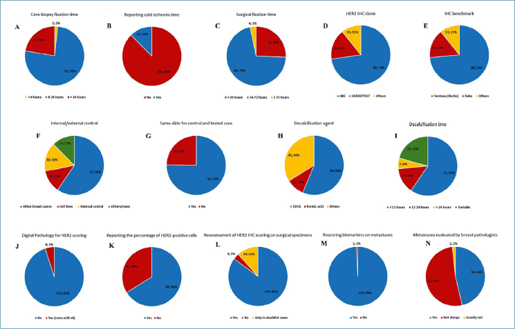 Regarding the initial exploratory survey, various relevant insights emerged from the participants’ responses to the questionnaire. Firstly, current guidelines recommend a total fixation time of 6 to 24 hours and 24-72 hours for biopsy and surgical specimens respectively18,19. Most participants adhered to this guideline, with only a few reporting extremely short or prolonged intervals: 2% less than 6 hours for biopsies, and 3% reported more than 72 hours for resections. This finding is particularly significant because under-fixation can lead to false-negative immunohistochemical results or, conversely, paradoxical false positives related to enhanced alcoholic post-fixation, making it unacceptable to perform IHC assays on specimens fixed for less than 6 hours18. Similarly, false-negative results can also be associated with over-fixation, primarily due to antigen cross-links caused by prolonged formalin exposure5. In this view, it could be reasonable to avoid having pathology laboratories receive breast specimens (especially biopsies) on Fridays - if the service is closed on Saturdays - preventing them from excessively prolonged fixation times. On the other hand, only a minority of the attendees (12%) were used to annotate cold ischemia time in their pathology reports. It is advisable cold ischemia time does not exceed 1 hour because long intervals between tissue excision and fixation may cause false-negative IHC results as well20. Physicians should stick to this point, trying to minimize cold ischemia time even when surgical specimens undergo radiology checks before getting to the pathology lab.