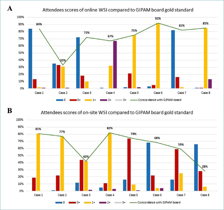 The comparison of the scores of the online and on-site WSIs between the attendees and the GIPAM directive board is summarized in Table II, while representative pictures of the most controversial cases are provided in Figure 5. Overall, considering both the online and the on-site WSIs, a substantial agreement (69%) was reached between the participants and the GIPAM board.