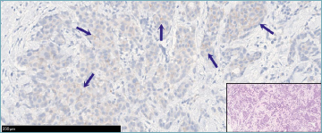 Figure 4. Case 6 from the online collection, showing a distinct quota of neoplastic cells displaying weak and incomplete membranous staining (HER2 1+). Such a sample achieved the highest concordance rate between the participants and the gold standard, with more than 90% of the attendees agreeing with the GIPAM board referral. A corresponding hematoxylin and eosin microphotograph is provided in the inset.