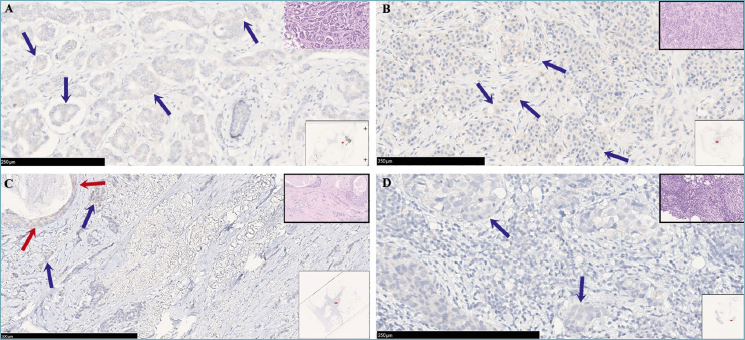 Figure 5. Representative HER2 immunohistochemical pictures of the most controversial cases. A HER2 0+ tumor (online cohort, case 2) arranged in a micropapillary architecture revealing scattered cells with partial membranous staining (blue arrows) (A). HER2 1+ positivity in another case (on-site cohort, case 3), showing a faint but still appreciable expression (blue arrows) in a noteworthy proportion of the cells (11-50%) (B). Weak membranous labeling (blue arrows) in a limited percentage of invasive carcinoma cells (on-site cohort, case 7). Positive elements in adjacent carcinoma in situ foci (red arrows) caused some attendees to score it as HER2 1+ (C). A solid growing tumor enriched with tumor-infiltrating lymphocytes (on-site cohort, case 8) displaying barely noticeable partial membranous HER2 immunostaining (blue arrows) but enough to label the case as HER2 0+ (D). Corresponding hematoxylin and eosin microphotographs for each case are provided in the insets.