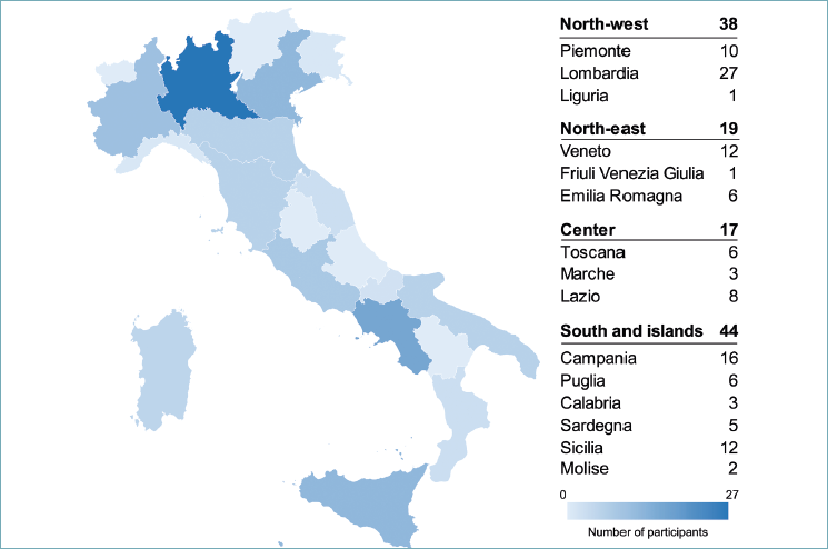 Figure 1. Distribution of 118 institutions across 15 regions in Italy participating in a national survey on PIK3CA testing for HR+/HER2- metastatic breast cancer.