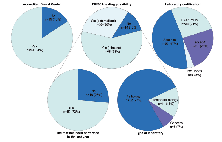 Among the 118 surveyed participants, 99 (83.9%) conducted their activities in hospitals with accredited breast centers. Compared with the 2023 survey, the current analysis suggests an overall increase in reported institutional capacity for PIK3CA testing. While approximately one third of institutions previously reported no access to in-house or outsourced testing, 88.1% (n = 104) of participating centers now report the ability to perform PIK3CA analysis, with more than half (57.6%; n = 68) offering on-site testing. Taken together, these findings are consistent with a reduction in previously reported structural limitations to test availability at the institutional level. The organization of testing also appears to have evolved, with pathology laboratories accounting for the majority of in-house analyses (76.5%; n = 52), compared with the more heterogeneous laboratory distribution reported in 2023. However, this increase in reported testing capacity has not been accompanied by a comparable improvement in quality frameworks. Nearly half of institutions (46.6%; n = 55) still operate without formal molecular accreditation, and ISO:15189 certification remains uncommon (3.4%; n = 4), suggesting that gains in access have not yet translated into uniform advances in laboratory standardization (Fig. 2). Institutions currently lacking testing capacity are detailed in Supplementary Figure S1.