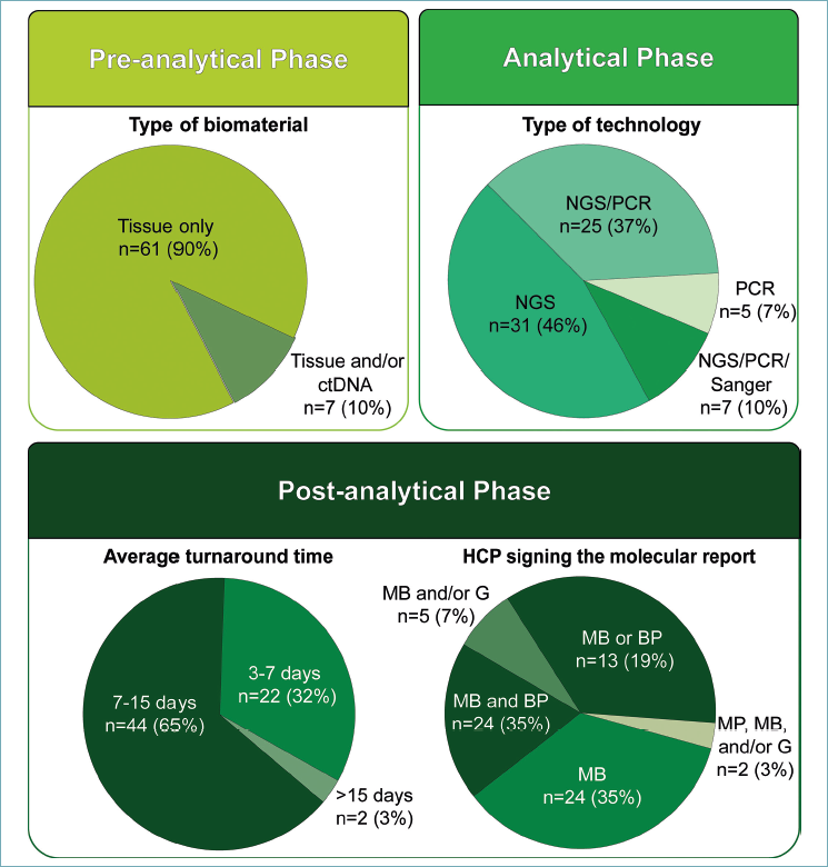 Figure 3. Overview of PIK3CA testing strategies from a national survey of 118 institutions. Pie charts depict the biomaterials used (pre-analytical phase), testing technologies (analytical phase), turnaround time, and report signatories (post-analytical phase), highlighting practices across all procedural stages. MB, molecular biologist; BP, breast pathologist; MP, molecular pathologist; G, geneticist.
