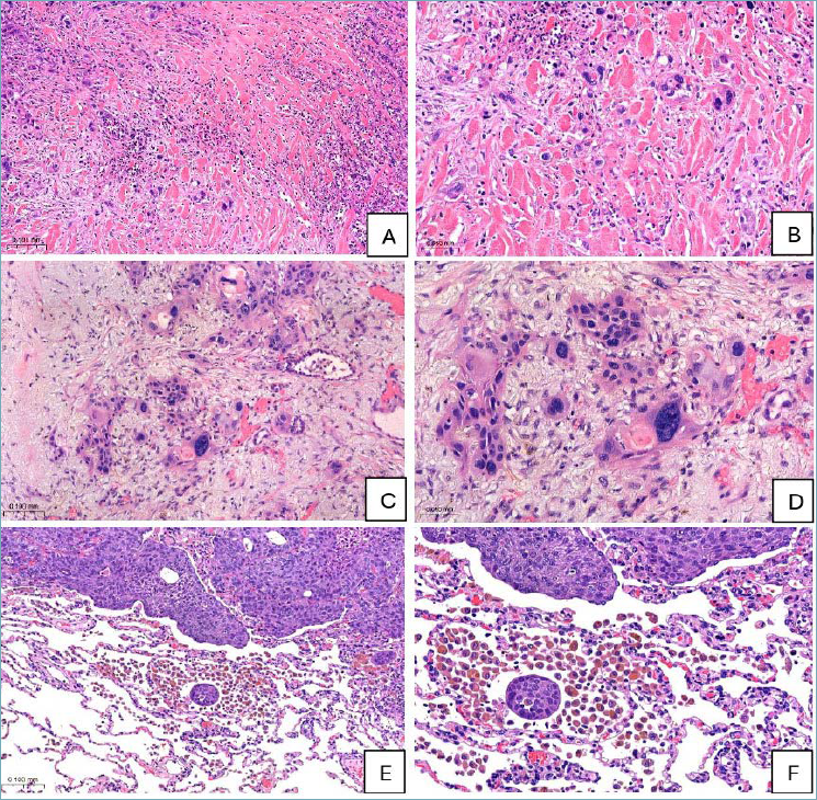 Figure 1. Statistically significant histological parameters of aggressiveness: high-grade tumour budding (TB) (A, H&E 200x and B, H&E 400x), large nuclei (C, H&E 200x and D, H&E 400x) and STAS (E, H&E 100x and F, H&E 200x).