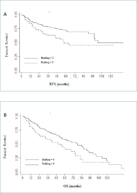 Patients with high-grade TB (≥ 5 buds in 200x field) demonstrated significantly higher recurrence rates compared with those with low-grade TB (0-4 buds in 200x field) (p = 0.0048). These results indicate that high TB is significantly associated with shorter RFS (Fig. 2, A).