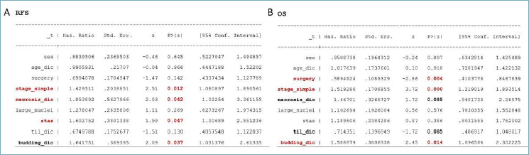 Figure 3. Multivariate analyses of tumour budding (TB) for recurrence-free survival (RFS) (A) and overall survival (OS) (B).