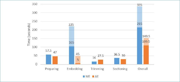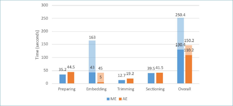 Preparation time per cassette was longer for ME (57.5 s) than AE (47 s). AE substantially reduced embedding times (5+40 s) compared with ME (105+120 s), but trimming time was shorter for ME than AE (16s vs. 27.5 s). Overall, AE was significantly faster than ME (p < 0.0001; Fig. 3).