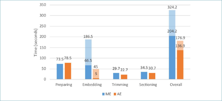 Figure 1. Graphic representation of the specific phases and overall timing for ME and AE for the endoscopic biopsy subgroup. Solid histograms represent the time spent by technicians on the specific phase. Shaded histograms in the embedding phase and overall time represent the supplement time requested if considering cooling and scraping (+120 s) with the ME approach, and the procedure as a whole (+40 s) rather than the technician time with the AE approach.