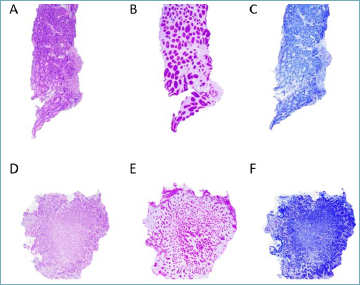 Figure 4. Representative images of histochemical stains following AE and ME (original magnification 40x, all images). A-C) Histochemical stains following AE, in particular hematoxylin and eosin (A), Alcian-BluPAS (B), and Giemsa (C). The blue arrow in each image indicate part of the Paraform used for AE. D-F) Histochemical stains following ME, in particular hematoxylin and eosin (D), Alcian-BluPAS (E), and Giemsa (F).