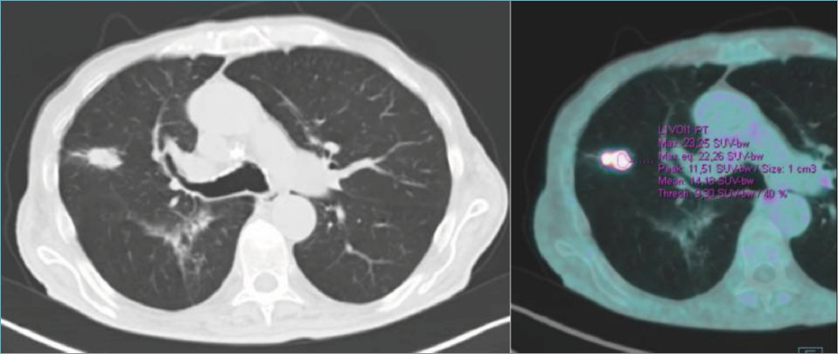 Figure 1. Pre-operative CT scan and 18FDG-PET CT, showing right upper lobe lesion