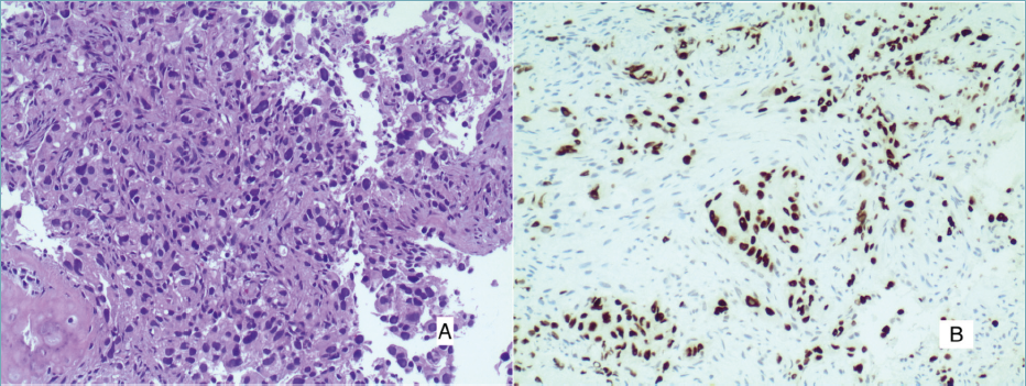 Figure 2. (A) Transbronchial lung biopsy shows a non-small cell carcinoma infiltration. A roughly glandular pattern can be observed. (B) TTF1 positivity confirms the diagnosis of lung adenocarcinoma.