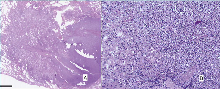 Figure 3. (A) The surgical specimen shows a well defined and circumscribed nodule. It is possible to appreciate two distinct areas, one with a lower cellularity (left) than the other (right). (B) At higher magnification, adenocarcinoma is seen on one side (left) and diffuse infiltrate of lymphoid cells on the other (right).