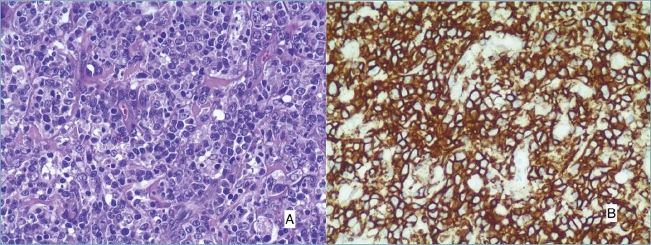Figure 4. (A) The lymphoid infiltrate comprises diffuse sheets of large cells, which are 2-4 times the size of normal lymphocytes. (B) CD20 staining demonstrates the B-cell origin of the large cells.