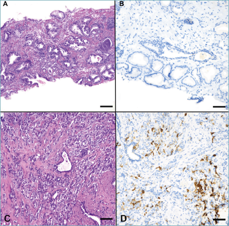 Figure 1. Immunohistochemical analysis of PD-L1 protein expression. The figure shows two representative cases of PCa (panel A and C, respectively, E&E, 100X magnification) analyzed with SP263 clone (panel B and D, respectively; 200x magnification), having higher PD-L1 expression (CPS > 1) in panel D and negative PD-L1 expression (CPS < 1) in panel B.