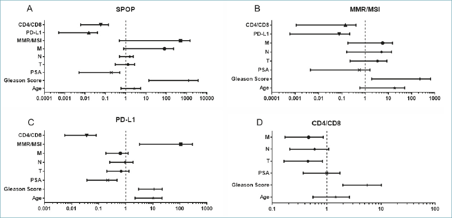 Figure 2. The figure shows the Forest plots regarding the correlation of SPOP expression (panel A), MMR/MSI status (panel B), PD-L1 expression (panel C) and TILs, as CD4/CD8 ratio (panel D), with the main molecular and clinic-pathological parameters.