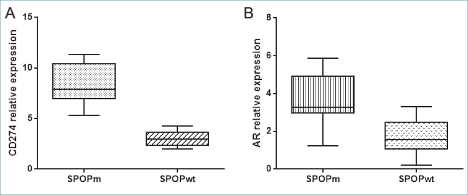 Figure 3. The figure shows the significant high expression of CD274 and AR in two PCas subgroups with SPOP mutations in comparison to those without mutations (p = 0.0006 and p = 0.0148, respectively).