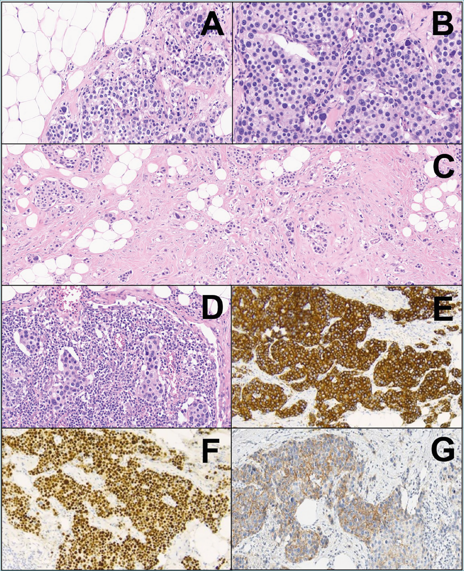 Figure 1. Highly illustrative figure of the most representative histological aspects of the neoplasm here described. A,B) Pre-operative biopsy showing neuroendocrine carcinoma with solid-nested architecture (hematoxylin-eosin, A: 10x original magnification, B: 20x). C) Tumor bed with diffuse fibrotic reaction after neoadjuvant chemotherapy (hematoxylin-eosin, 4x). D) Nodal metastasis: note tumor cell clusters in the marginal sinus of the lymph node (hematoxylin-eosin, 10x). E,F,G) Immunohistochemical microphotographs (10x) highlighting diffuse positivity for synaptophysin (E) and for Estrogen receptor (F), and the pattern of Her2 positivity (G) in the highest-cellulated area in the post-neodjuvant treatment.