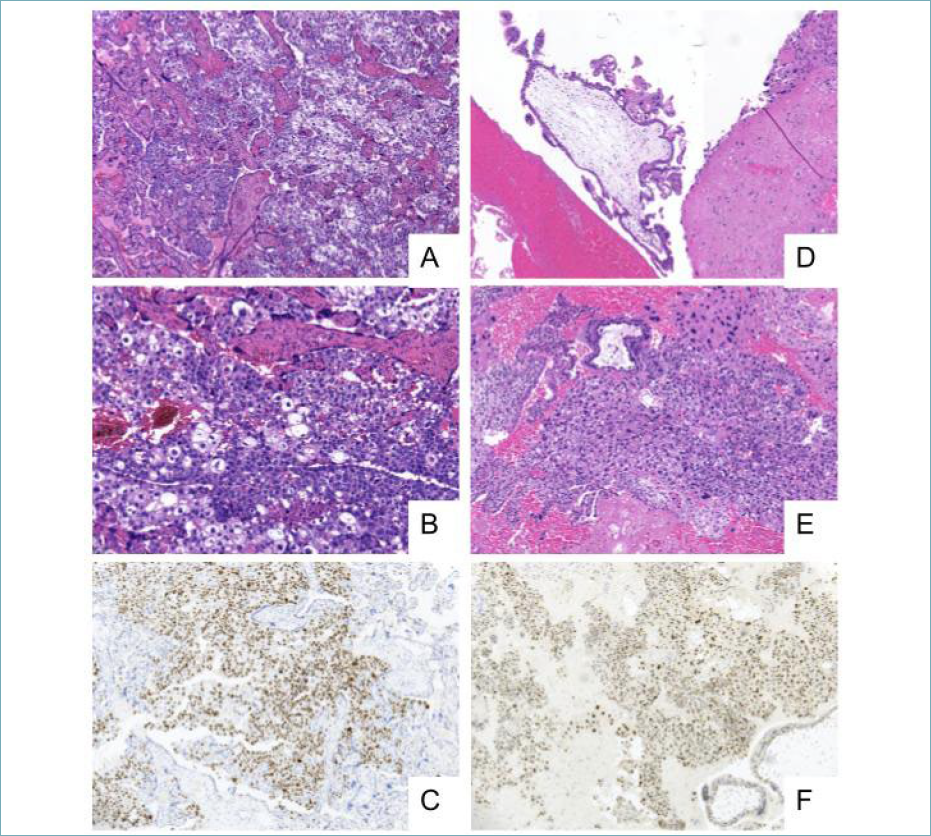 A 30-year-old female presented to the Gynecology Emergency Unit for vaginal bleeding at the 12th week of pregnancy. Transvaginal ultrasound revealed irregular and heterogeneous intrauterine material with peripheral vacuolization and a central hemorrhagic area. There was no evidence of echoes referable to embryos. Laboratory tests revealed elevated serum hCG (240,457 U/L). Revision of the uterine cavity was performed. Specimen examination demonstrated largely edematous chorionic villi with myxoid stroma without stromal vessels and with stromal cisterns; parts of villi demonstrated necrotic changes and diffuse circumferential hyperplasia of trophoblast with trophoblast inclusions. Diffuse solid sheets of marked atypical cells were present, showing a brisk mitotic activity and elevated proliferative index Ki-67 (Fig. 1D-F). Molecular analysis were attempted but DNA quality was low and not assessable.